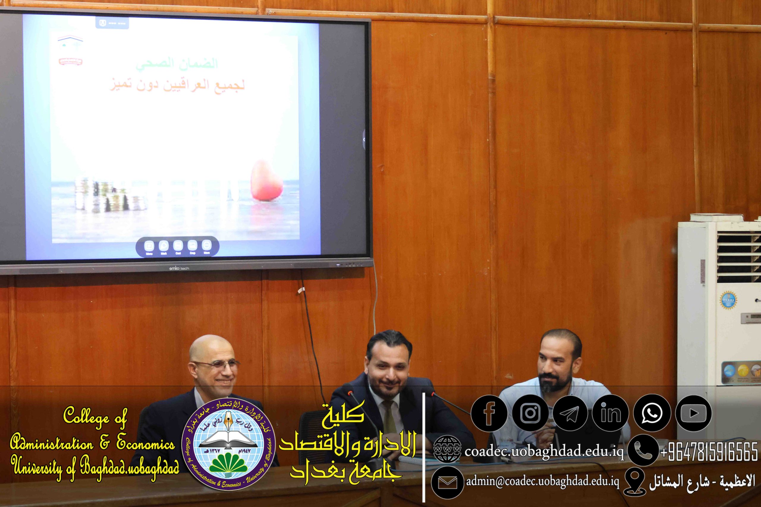 برعاية الأستاذ الدكتور صباح منفي رضا، عميد كلية الإدارة والاقتصاد، نظّمت الكلية بالتعاون مع وزارة الصحة / هيئة الضمان الصحي ورشة عمل تعريفية بعنوان: “قانون الضمان الصحي رقم 22 لسنة 2020 وآليات تطبيقه”، قدّمها كل من الدكتور أحمد غازي، وعلاء مالك، وسرمد عدنان، بحضور نخبة من الأكاديميين والمهتمين بالشأن الصحي والاقتصادي.