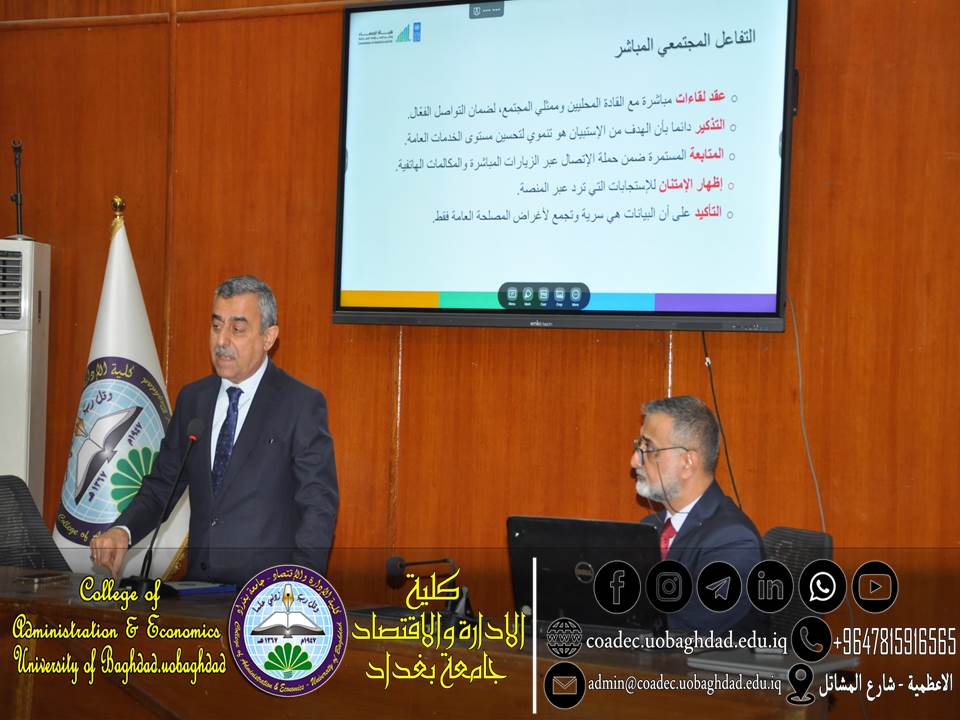 برعاية الاستاذ الدكتور صباح منفي رضا عميد الكلية نظمت كلية الادارة والاقتصاد ندوة تشاورية حول مدى رضا المواطنين عن الخدمات العامة وأهمية منهج المواطن في قياسه قدمها الدكتورمهدي العلاق مستشار البرنامج والدكتور احمد ياسين من هيئة الاحصاء في وزارة التخطيط والاستاذ حارث عبد الحميد من مكتب الامم المتحدة الانمائي