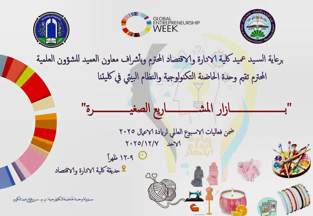 برعاية السيد عميد الكلية الاستاذ الدكتور صباح منفي رضا ، وتحت اشراف معاون العميد للشؤون العلمية والدراسات العليا أ.د. جاسم محمد مصحب ، اقامت وحدة الحاضنة التكنولوجية والنظام البيئي ، بازار المشاريع الصغيرة ضمن فعاليات الأسبوع العالمي لريادة الأعمال 2025 بإشراف م.م. سرى فؤاد عبدالكريم مسؤولة الوحدة.