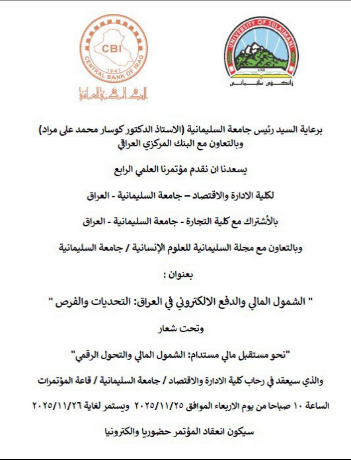 الذي نظمته جامعة السليمانية تحت شعار نحو مستقبل مالي مستدام (الشمول المالي والتحول الرقمي ) بمشاركة كلية الادارة والاقتصاد وكلية التجارة بجامعة السليمانية