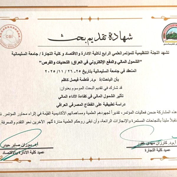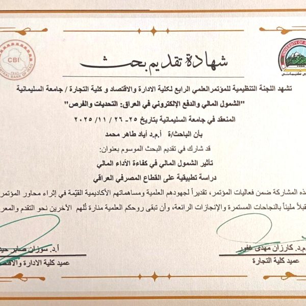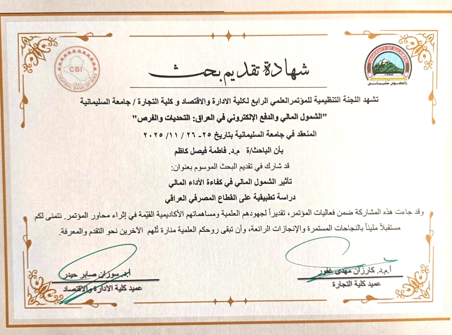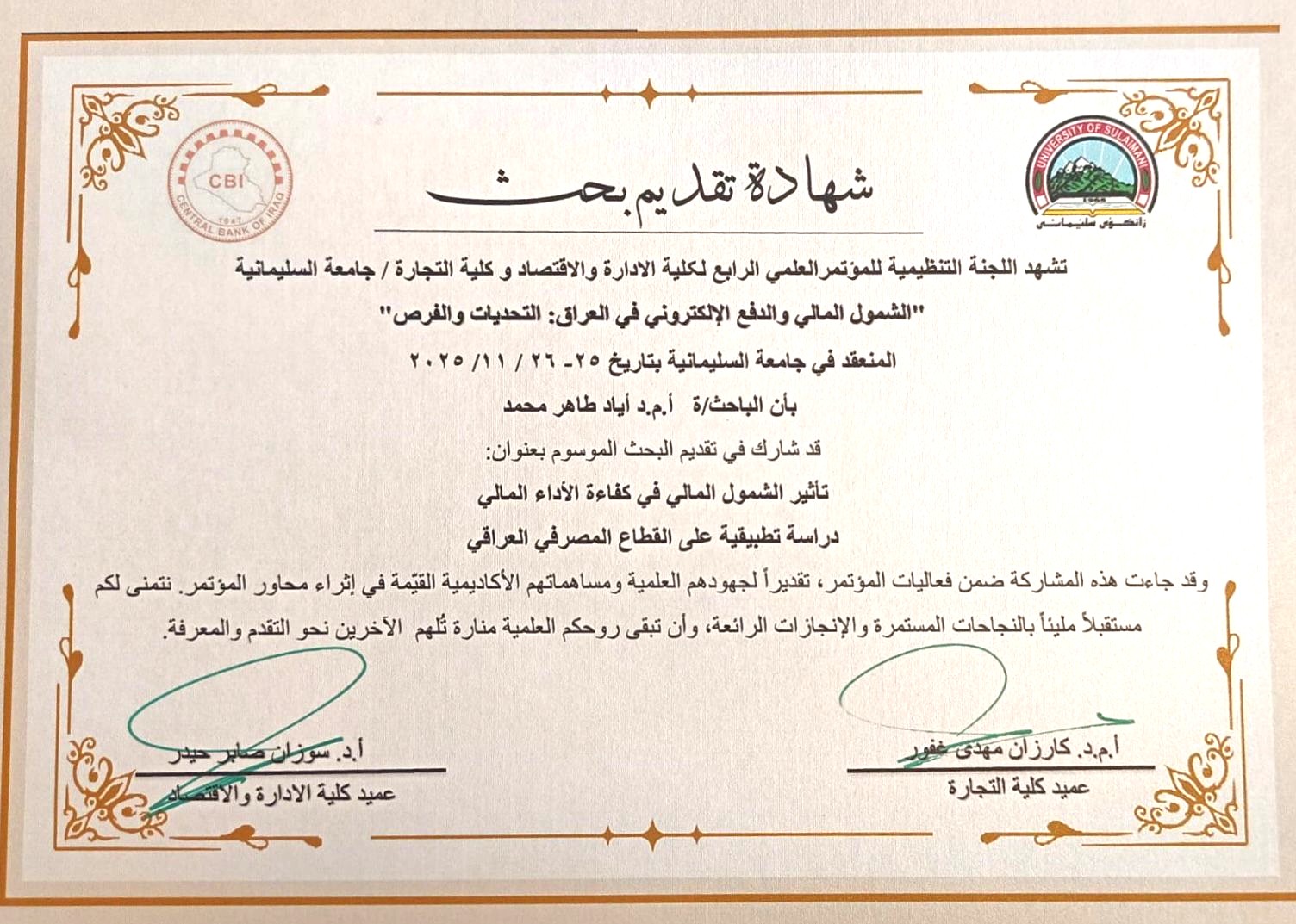 وشارك التدريسيان ببحث مشترك بعنوان ( تأثير الشمول المالي في كفاءة الأداء المالي) دراسة تطبيقية على القطاع المصرفي العراقي.