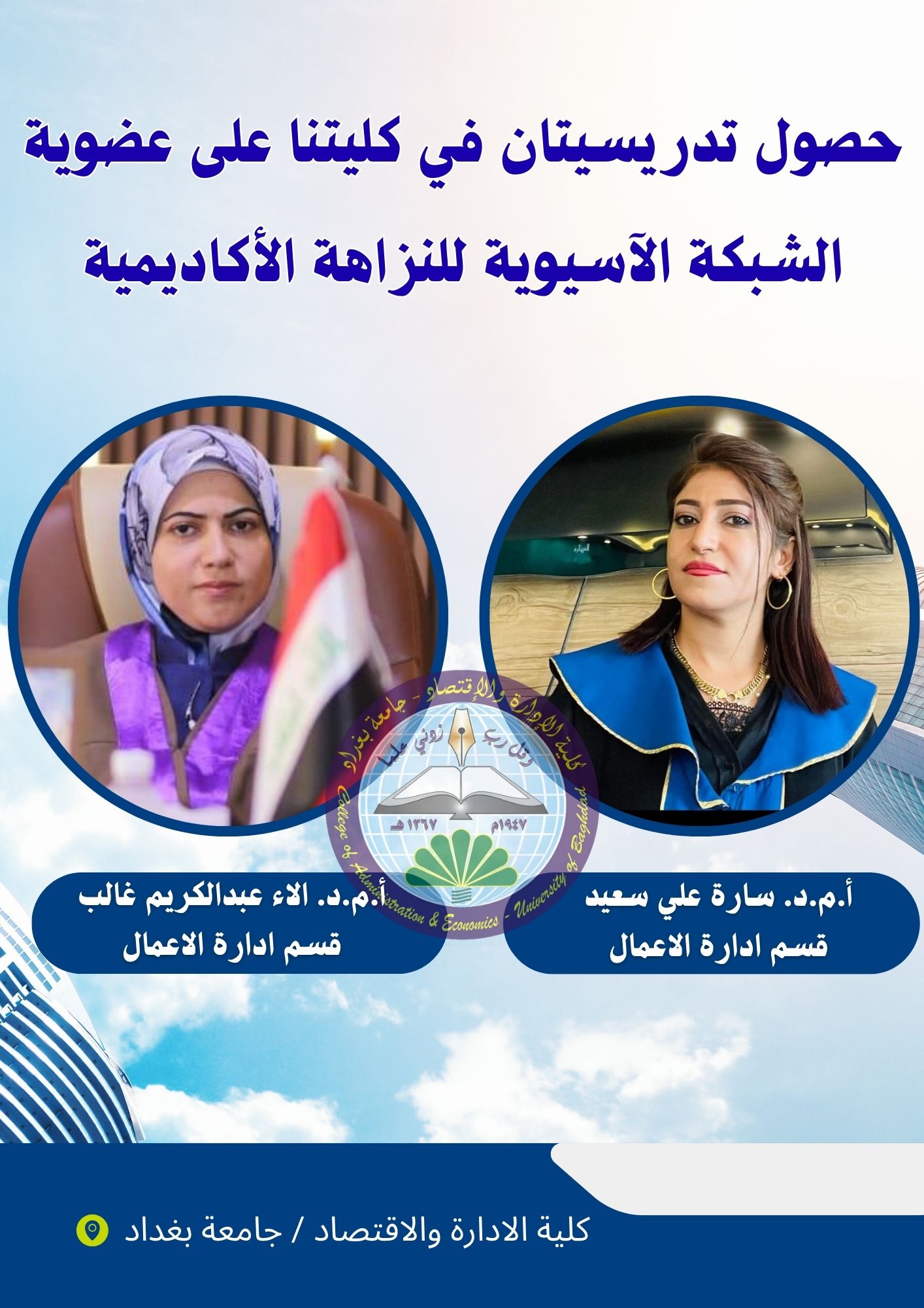 حصلت التدريسيتان الأستاذ المساعد الدكتورة سارة علي سعيد العامري والأستاذ المساعد الدكتورة آلاء عبد الكريم غالب المدو ، من قسم ادارة الاعمال في كليتنا ، على عضوية الشبكة الآسيوية للنزاهة الأكاديمية (Asia Pacific Network for Academic Integrity – APNAI).