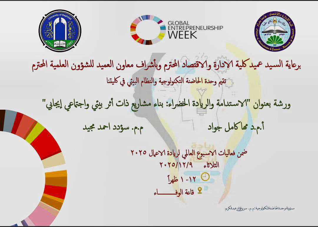 نظمت وحدة التعليم المستمر بالتعاون مع قسم ادارة الاعمال ورشة بعنوان ( الاستدامة والريادة الخضراء بناء مشاريع ذات اثر بيئي واجتماعي ايجابي ) ، قدمتها ا.م.د. مها كامل جواد و م.م. سؤدد احمد مجيد.