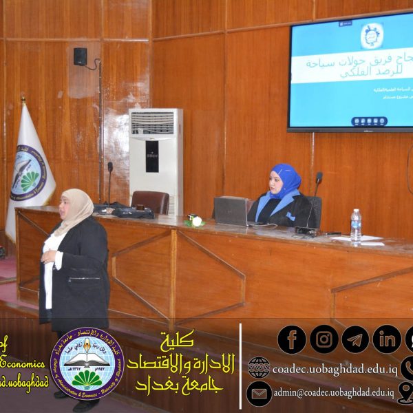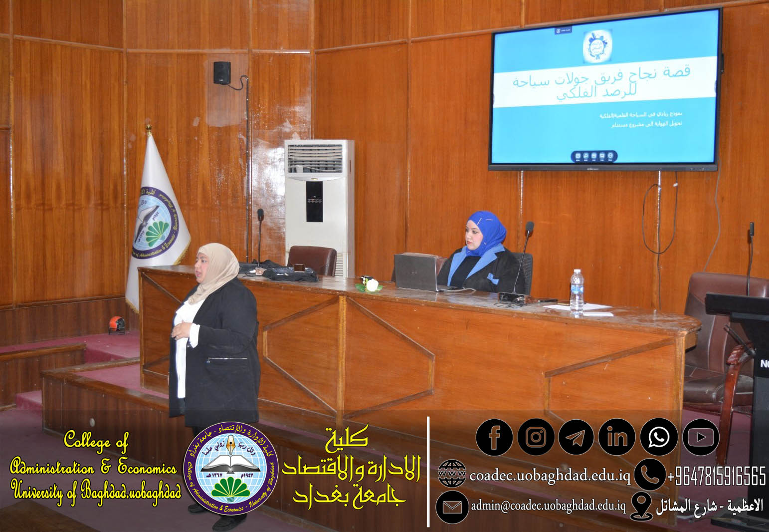 حيث ادار المحاضرة المدرس الدكتور منال حميد التدريسية بقسم الادارة العامة ، وتُعد السيدة هدى فلاح إحدى خريجات قسم الإدارة العامة في الكلية، حيث استعرضت برفقة شقيقتها قصة نجاح مشروعهما المبتكر تحت عنوان “فريق جولات سياحة فلكية”، الذي يمثل نموذجاً رائداً في الجمع بين السياحة والعلوم الفلكية.