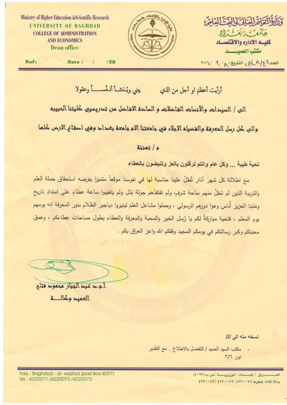 تهنئة السيد العميد بمناسبة عيد المعلم